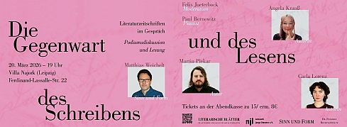 Das netzwerk junge literatur e.V. lädt am 20. März 2026 um 19 Uhr zu einer Podiumsdiskussion mit Lesungen und musikalischen Zwischenspielen in die Villa Najork ein. Unter dem Titel »Die Gegenwart des Schreibens und des Lesens – Literaturzeitschriften im Gespräch« treten zwei Periodika ins Gespräch: die seit 1949 von der Akademie der Künste herausgegebene Literaturzeitschrift SINN UND FORM und die 2019 in Leipzig gegründeten Literarischen Blätter, die jungen Autoren und Autorinnen eine Stimme geben.