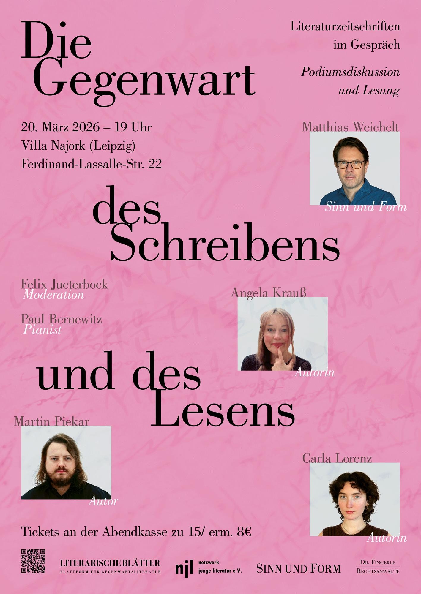 Podiumsgäste sind Matthias Weichelt (Berlin), Angela Krauß (Leipzig), Martin Piekar (Frankfurt a. M./Berlin) und Carla Lorenz (Wien/Leipzig). Mit Weichelt und Krauß (Sächsischer Literaturpreis 2024) sind zwei etablierte Stimmen des deutschsprachigen Literaturbetriebs vertreten. Weichelt ist Autor, Literaturwissenschaftler und seit 2013 Chefredakteur von SINN UND FORM, Krauß schon seit den 1980er Jahren eine konstante Stimme der deutschsprachigen Gegenwartsliteratur. Piekar (*1990) und Lorenz (*2001) repräsentieren die jüngere Generation. Piekar, dessen Debütroman Vom Fällen eines Stammbaums im Mai 2026 bei Rowohlt erscheint, gewann 2023 den Kelag-Preis beim Bachmannwettbewerb in Klagenfurt. Lorenz stand 2025 auf der Shortlist des WORTMELDUNGEN Ulrike-Crespo-Förderpreises und veröffentlichte zuletzt in die horen (Wallstein, Heft 299). Moderiert wird die Veranstaltung von Felix Jueterbock (Bochum), Literaturwissenschaftler und Chefredakteur der Literarischen Blätter. Die musikalische Begleitung übernimmt der Leipziger Pianist und Gründer der Literarischen Blätter, Paul Bernewitz.